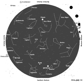 As Regulus sets soon after the sun, Antares appears in full glory in the south not five degrees below Jupiter. Marking the heart of the scorpion, Antares is not only the 15th brightest star but also the reddest in all the heavens.