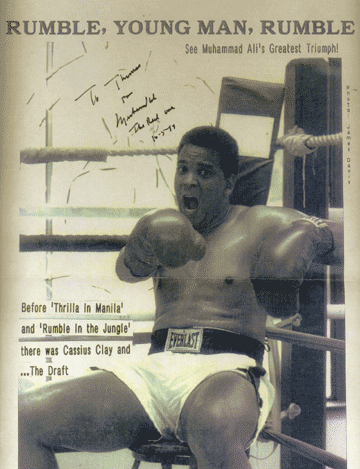 Thomas has framed the poster. In the top corner, a halting cursive declares: To Thomas, from Muhammad Ali. The real one.