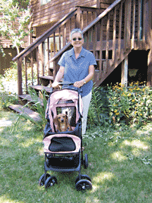 Rose is recovering well. In my house, dining-table side chairs are strewn across the sofa, a deterrent to high jumps. An ice-pink pet stroller awaits in the garage for walks to the Bay. Corrals and baby grates proliferate. The vet says Rose will likely get back to normal. I don’t know if she’ll rise to chasing squirrels or birds, but I can hardly wait for the military crawl to begin.