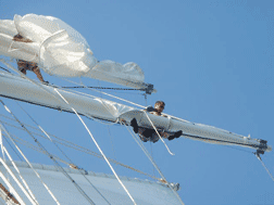 “The rigging is my favorite part on the whole ship,” says Katie Fitzgerald, who thinks nothing of furling the square mizzens while hanging 100 feet aloft in a 20-knot breeze.
