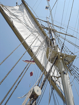 “I’ve been working out in the gym again,” said passenger Rick Judge from Delaware Beach after hauling up the mainsail alongside two sailors. You can see by the sweat on his brow in the cool New England breeze that he’s not kidding. Sailing this ship is a workout.