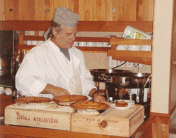 He serves three courses during the casual sit-down meal. The first, an appetizer, is delicately arranged before the dinner bell. An entrée follows, a mahi-mahi sitting on a bed of wild rice, or a slice of au-jus prime rib or lamb with a touch of herbs or Asian seasonings. Vegetarians are always accommodated. And when you think yourself too full to touch another bite, there’s dessert: berry pies, chocolate cakes, cheesecakes and ice cream.