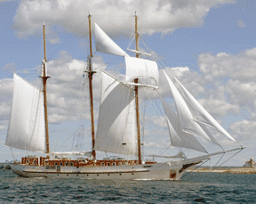 When the Mystic sails into your ken, she’ll set you dreaming and wondering. At 170 feet from bow to stern, she’s half as long as a football field. With rigging towering 107 feet into the sky, she rises like cathedral spires. She’s a new ship on the horizon, a 2007 hybrid of her traditional class, an authentic sailboat combining modern comforts with historic looks.