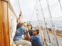 Passenger Willy Heron, from the Boston area, had dreamed of climbing into the rigging of a tall ship. So one foggy morning, while we were at anchor, first mate JoAnna Josie helped him make a slow, steady climb aloft.