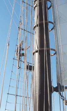 “Normally, the view up there is incredible,” says crewmember Erin Ryding, who knows the rigging intimately, having helped assemble much of it.