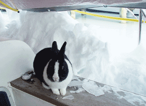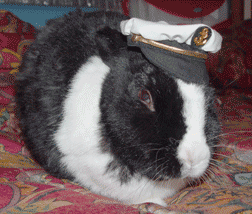 A year after Ferd became part of our family, we sold our home and moved aboard a boat on Chesapeake Bay. In the beginning, we leased a houseboat to confirm our decision to live on the water. We didn’t know how Ferd would adapt, since bunnies, like cats, aren’t keen on being in water. The boat had a large foredeck, protected so he couldn’t fall overboard, that provided plenty of play space, and he soon seemed quite content with his new environment. The gentle rocking motion of the boat didn’t bother him at all. Once when we got caught in a pop-up storm on a cruise, we took a couple of large waves that flooded the foredeck and sent him and his special outdoor rabbit hutch afloat for a few minutes. He never showed signs of fear or panic, but he sure did shoot the captain a look of intense disgust, laying his ears back flat, and erecting his mohawk, a tuft of fur that puffed up between his ears when he was displeased.