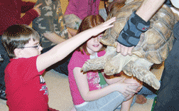 To gain prime viewing of the scaly visitors, kids gathered around three long, green, lizard-printed fabric rectangles duct-taped to the floor. Kristal toured his reptilian creatures up and down the three runways so students could get an up-close glimpse or reach out and touch. When Kristal walked past with his snakes, turtles and lizards, children shrieked, giggled and exclaimed amazement. Some scooted in closer or retreated farther, depending on their comfort with scaly, slithering friends.