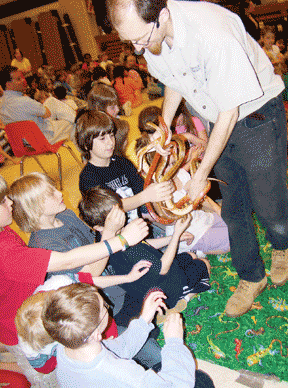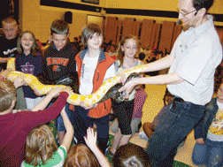 Two of his larger creatures made for a grand finale. Like a good ringmaster, Kristal built up suspense before reaching into a large Rubbermaid bin and pulling out two Burmese pythons to the sound of excited gasps. Five lucky fourth and fifth graders helped carry the python pair one brown and one albino around the cafeteria, holding up the smooth, scaly, seven-foot-plus giants while Kristal held onto their spade-shaped heads.
