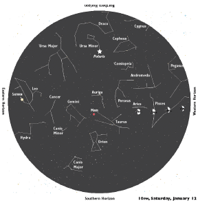 Sunset also reveals the bright, steady light of Mercury hugging the southwest horizon. On the evening of the 10th, look for the waxing crescent moon about 10 degrees above Mercury. The fleet planet sets before 6:30, although it climbs higher and sets a little later over the next two weeks.