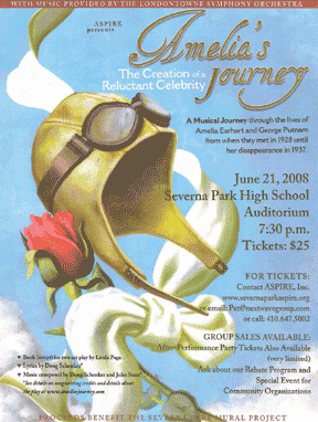 From start to finish, the production relies on local talent. Schenker has been writing songs since he was a kid, yet he earns his living as an attorney in Annapolis. When he became fascinated by the personal and business relationship between Earhart and Putnam, he recruited local playwright and children’s rights activist Linda Page (who died in November, 2007) to write the script.