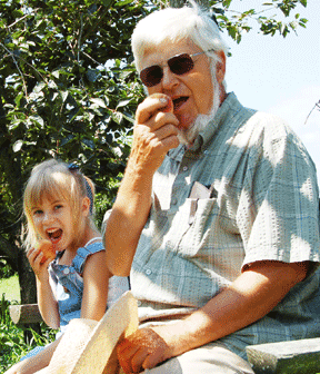 First order of the day was to pick peaches, and accommodating Frank who Bay Weekly readers know as The Bay Gardener had set aside a young tree with ripening fruit for Grumps. With Frank, Spooks, Dandy and Grandpop in tow, Grumpy soon had a sack of peaches then it was a stop at a nearby Hatteras swinging chair to sample the crop. A great opportunity for this once farm boy to ask a question always nagging me about peaches, my favorite fruit when fully ripe and soft.