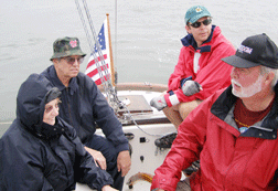 Elaine Tiller, her husband Bob, skipper Andrew Cole and crewmember Marc Stanley ride the starting line in a rare moment without rain.