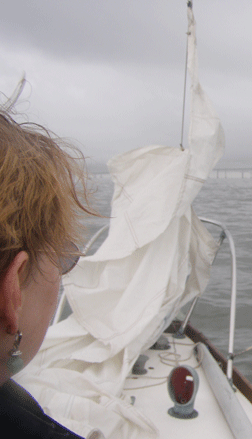 Hospice worker Elaine Tiller watches as the Bay Bridge disappears into the clouds before the aborted start of Hospice Cup.