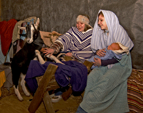 A donkey and ox for Mary and Joseph, shepherds with their sheep and the three wise men and a camel: All gathered in a stable to celebrate the birth of their savior. That peaceful scene is reenacted every Christmas season in living nativities. Humans portray their counterparts quietly, but when live animals enter the scene, peace may give way to chaos with jumping goats, bucking donkeys and runaway sheep. Who’s at the MangerIn the cold December dusk, the nativity scene at Lower Marlboro Church was coming to life. In a shed, Joseph and Mary sat on bales of straw. A penned duck quacked and two chickens clucked. Christmas music rang from a hidden boom box as Jan Heaton, barnyard wrangler, led in additional cast members: two goats, Lightning and Cowboy. Lightning named for her lightning-fast birth stayed true to her name. In a flash, she flew up and across Mary’s lap for a seat on the straw. Cowboy, aka the leaping goat of Calvert County, stood by tethered, quietly eating the set. At Riverdale Baptist Church, the predictably unpredictable animals have been removed from staged performance. But rented sheep and goats and Taco the donkey, on loan from Patuxent Wildlife Sanctuary, still have a place in the manger. Even in that sacred place, they have minds of their own. “Fox TV usually comes out and puts us on live television,” says Carol Donohue, prefacing a tale of chaos at her church’s large-scale nativity. “One year, my granddaughter Taylor, who was just six years old, was holding the reins of Taco the Donkey.” With cameras rolling, Taco decided it was time to leave. Taylor wouldn’t let go. She was pulled across the sidewalk and driveway with a live TV audience along for the ride. Both child and donkey were caught, unharmed, and returned to the nativity scene. Crossroad Christian Church in St. Leonard gave up live animals four years ago, but not because of their tendency to wander. “We had responsibility to care for them and prided ourselves on the care we gave them,” says Jan Baxter. “Then several years ago, we didn’t have anybody who could take care of them during the four days of the nativity scene. Because we couldn’t care for them the way we used to, we’ve stopped using them. It’s too bad, because the animals loved the attention, and got plenty of it.” In Solomon’s, Our Lady Star of the Sea has a living nativity, but no live animals. “We don’t have live animals because we have no way to care for them,” Barbara Sewell told Bay Weekly. “Besides, it’s hard enough to get human volunteers, let alone animal volunteers.”