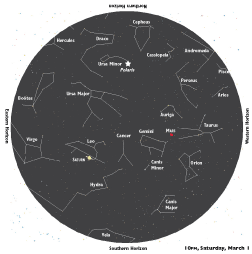 Up and away from Earth, all five naked-eye planets are visible this week. Mars appears high in the south-southwest at sunset. Saturn shines low in the east at sunset and is in the south come midnight. Jupiter rises after 3am and shines low in the southeast as dawn nears. Mercury rises in the southeast before 6am, followed closely by brilliant Venus, very low but many times brighter.