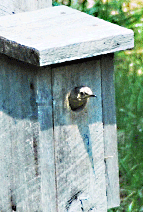 This female wanted the upscale home, but the chickadees were living there. The male made every effort to talk his wife into considering the old house. He flew by it; he perched on the flat roof; he hovered by the front door; he carried grass to the entrance to give her the hint.