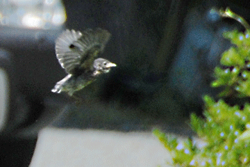 Each fledgling appeared, one at a time, with just a beak visible through the hole. It would retreat, then reappear a little farther out of the hole. Sometimes the father would flutter nearby, showing the young how to fly. Finally, the fledgling took the leap and, pounding its wings, made an ungainly flight focused on the bush, willing the newly feathered wings to keep up.