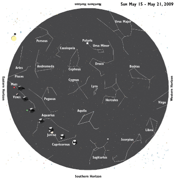 The waning moon rises after midnight this week and reaches last-quarter phase Sunday the 17th, when it travels through pre-dawn skies with Jupiter. Both rise in the east-southeast around 2am, with milky Jupiter less than three degrees to the south. As dawn approaches, they are high in the southeast. With sunrise at 6am, Jupiter winks from view, but the moon remains a ghost traveling westward through morning skies.