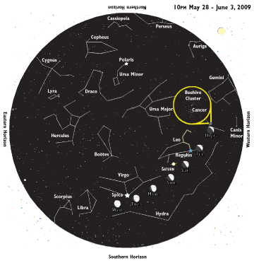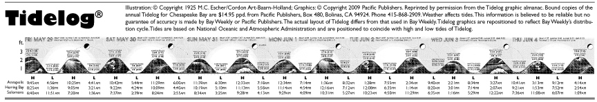 Sky Watch Follow the MoonWax your nights awayThe moon waxes through the spring constellations of the zodiac this week, providing an easy guide to the southern sky. As the sun sets Thursday around 8:20, the crescent moon appears high in the west. Twenty degrees to the moon’s right shine Pollux and Castor, the Gemini twins, while Regulus, the heart of Leo the lion, shines the same distance to the moon’s left. Compared to these three first-magnitude stars and their clear constellations, you could easily miss Cancer, the crab, between them. But on this night, the moon is smack-dab in the middle of it. The crab boasts no first-magnitude stars, but it does host the Beehive Cluster, M44. With unaided eyes, look for a smudge of light a few degrees to the upper right of the moon. Zero in with a small telescope or even a pair of binoculars, and you’ll see, as did Galileo, “a mass of more than 40 small stars.” Today, we know that this distant cluster is abuzz with hundreds of stars. Sunset Friday finds the moon farther to the east, now less than 10 degrees to the lower right of blue-white Regulus. Named by Copernicus, this kingly star lies in the handle of the Sickle of Leo, which looks like an inverted question mark outlining the head and chest of the celestial lion. Come Saturday, the moon has crept to the southwest of Regulus and is flanked to the northeast by Saturn. With an outstretched arm, your closed fist covers roughly 10 degrees, more than enough tonight to obscure both the moon and Regulus or the moon and Saturn. Sunday’s first-quarter moon shines 10 degrees below Saturn. With the new week, the waxing gibbous moon edges toward Virgo. Tuesday it is little more than five degrees to the right of the constellation’s alpha star Spica, and Wednesday it is still less than 10 degrees to Spica’s left. Illustration: © Copyright 1925 M.C. Escher/Cordon Art-Baarn-Holland; Graphics: © Copyright 2009 Pacific Publishers. Reprinted by permission from the Tidelog graphic almanac. Bound copies of the annual Tidelog for Chesapeake Bay are $14.95 ppd. from Pacific Publishers, Box 480, Bolinas, CA 94924. Phone 415-868-2909. Weather affects tides. This information is believed to be reliable but no guarantee of accuracy is made by Bay Weekly or Pacific Publishers. The actual layout of Tidelog differs from that used in Bay Weekly. Tidelog graphics are repositioned to reflect Bay Weekly’s distribution cycle.Tides are based on National Oceanic and Atmospheric Administration and are positioned to coincide with high and low tides of Tidelog. |