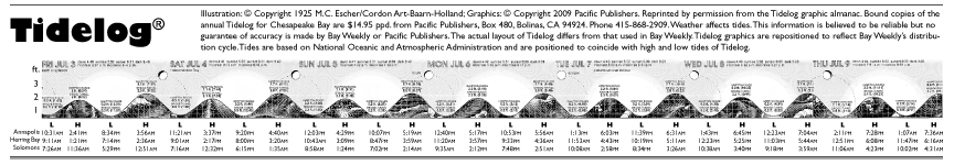 by J. Alex Knoll Great AntaresThank heaven this red giant isn’t our sunThe waxing gibbous moon travels along the ecliptic in a shallow arc through southern skies, the same path that the sun will travel during the day six months hence. Look for Luna just a few degrees to the west of Antares, the heart of the scorpion, Friday night. Antares is the 15th brightest star in our sky second only to Betelgeuse in size. At 520 light years from us, it is the star’s massive girth rather than its temperature, cooler than our sun, that makes it appear so bright. More than 500 times the size of our sun, Antares would stretch past Mars and into the asteroid belt were it the center of our solar system. Tuesday marks July’s full moon, dubbed the Red Cherries Moon, the Mead Moon, and, with their growth of new antlers, the Buck Moon. The sun sets around 8:30 this week, revealing Saturn high in the west between the constellations Leo and Virgo. While Saturn is as bright as any star, it is rather disappointing viewed in a telescope, as its rings face us near dead-on. As Saturn sets around midnight in the west, Jupiter rises in the east. In a dim part of the heavens nestled between Capricornus and Aquarius, there’s no mistaking Jupiter. For several hours, Jupiter’s rule is unchallenged. Then, a little after 3am, Venus rises in the east-northeast to become the brightest light overhead other than the sun and moon. Almost indistinguishable from the stellar backdrop, ruddy Mars shines just a few degrees west of Venus. With the approach of dawn, after 5:45 this week, Mercury crests the horizon just before the coming sun. You’ll likely need binoculars and a clear horizon to spot this surprisingly bright planet amid the pre-dawn glow far behind Venus and Mars. Illustration: © Copyright 1925 M.C. Escher/Cordon Art-Baarn-Holland; Graphics: © Copyright 2009 Pacific Publishers. Reprinted by permission from the Tidelog graphic almanac. Bound copies of the annual Tidelog for Chesapeake Bay are $14.95 ppd. from Pacific Publishers, Box 480, Bolinas, CA 94924. Phone 415-868-2909. Weather affects tides. This information is believed to be reliable but no guarantee of accuracy is made by Bay Weekly or Pacific Publishers. The actual layout of Tidelog differs from that used in Bay Weekly. Tidelog graphics are repositioned to reflect Bay Weekly’s distribution cycle.Tides are based on National Oceanic and Atmospheric Administration and are positioned to coincide with high and low tides of Tidelog. |