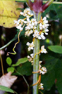 July and August are the best time of year to find dodder growing along the shores of the Bay and its tributaries. In the upper reaches of Rockhold Creek, north of Upakrik Farm, large patches of it grow along the shore. Over several years, they appear to be expanding.