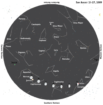 The waxing gibbous moon reaches first-quarter Thursday, appearing low in the south at sunset, before 7:45 this week. The red light shining beside the moon’s outer edge is Antares, the lead star in the constellation of Scorpius.