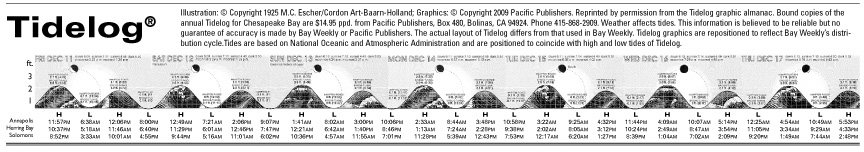 Illustration: © Copyright 1925 M.C. Escher/Cordon Art-Baarn-Holland; Graphics: © Copyright 2009 Pacific Publishers. Reprinted by permission from the Tidelog graphic almanac. Bound copies of the annual Tidelog for Chesapeake Bay are $14.95 ppd. from Pacific Publishers, Box 480, Bolinas, CA 94924. Phone 415-868-2909. Weather affects tides. This information is believed to be reliable but no guarantee of accuracy is made by Bay Weekly or Pacific Publishers. The actual layout of Tidelog differs from that used in Bay Weekly. Tidelog graphics are repositioned to reflect Bay Weekly’s distribution cycle.Tides are based on National Oceanic and Atmospheric Administration and are positioned to coincide with high and low tides of Tidelog. |