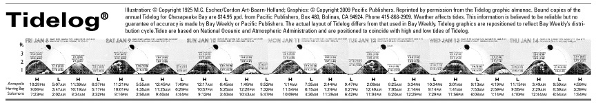 Illustration: © Copyright 1925 M.C. Escher/Cordon Art-Baarn-Holland; Graphics: © Copyright 2009 Pacific Publishers. Reprinted by permission from the Tidelog graphic almanac. Bound copies of the annual Tidelog for Chesapeake Bay are $14.95 ppd. from Pacific Publishers, Box 480, Bolinas, CA 94924. Phone 415-868-2909. Weather affects tides. This information is believed to be reliable but no guarantee of accuracy is made by Bay Weekly or Pacific Publishers. The actual layout of Tidelog differs from that used in Bay Weekly. Tidelog graphics are repositioned to reflect Bay Weekly’s distribution cycle.Tides are based on National Oceanic and Atmospheric Administration and are positioned to coincide with high and low tides of Tidelog. |