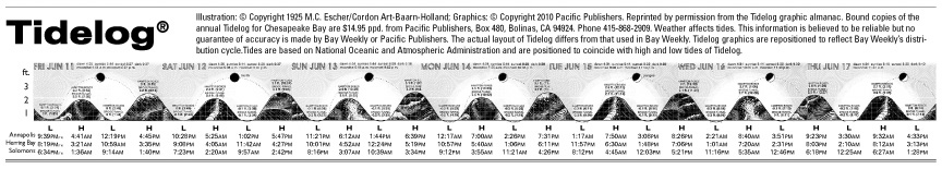 Illustration: © Copyright 1925 M.C. Escher/Cordon Art-Baarn-Holland; Graphics: © Copyright 2010 Pacific Publishers. Reprinted by permission from the Tidelog graphic almanac. Bound copies of the annual Tidelog for Chesapeake Bay are $14.95 ppd. from Pacific Publishers, Box 480, Bolinas, CA 94924. Phone 415-868-2909. Weather affects tides. This information is believed to be reliable but no guarantee of accuracy is made by Bay Weekly or Pacific Publishers. The actual layout of Tidelog differs from that used in Bay Weekly. Tidelog graphics are repositioned to reflect Bay Weekly’s distribution cycle.Tides are based on National Oceanic and Atmospheric Administration and are positioned to coincide with high and low tides of Tidelog. |