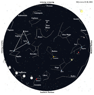 ![]() ![]() Sky Watch by J. Alex Knoll Topsy-TurvyLooking at a star map, the world really is turned upside-downA reader asked what she was seeing from her northeast-facing window. “Would I see evening or morning stars in this direction?” And would the same be true for planets? “I did look at your column and thought I understood the paragraph about Venus, but now I'm not so sure. Help! Thanks a bunch.” Only after reading and re-reading did I realize her problem: I was flat-out wrong, falling victim to my own sky map, inverting east and west, thus greatly confusing this reader and, perhaps, you. Venus hovers above the horizon at the right of this week’s sky map, just as it did last week. But while a typical terrestrial map has east to the right, celestial maps have west to the right. My apologies. Looking to the east after sunset, you will not see Venus, but rather bluish Altair, one of the three points of the Summer Triangle. While brilliant, this first-magnitude star pales compared to Venus, blazing above the west horizon, so bright that she pierces the glow of the setting sun. Readers from time to time point out that the sky map accompanying this column has east and west reversed. Were it a terrestrial map, they would be right, as the vantage or perspective is from above looking down. However, it’s just the opposite while standing on terra firma looking up at the heavens. To see what I mean, take the star map with you outside. Tilt your head back so that north is to the top of your head and your chin pointing south. You'll see then that east is to your left and west to the right. From this reader’s northeast vantage, on Herring Bay no less, she looks out above the water at the stars of the Summer Triangle: Altair Vega and Deneb. Toward the opposite, western horizon, Venus is loosely aligned with Regulus, Mars and Saturn. |