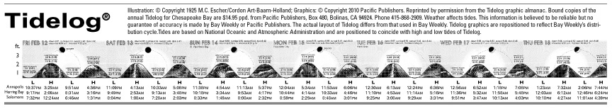 Illustration: © Copyright 1925 M.C. Escher/Cordon Art-Baarn-Holland; Graphics: © Copyright 2010 Pacific Publishers. Reprinted by permission from the Tidelog graphic almanac. Bound copies of the annual Tidelog for Chesapeake Bay are $14.95 ppd. from Pacific Publishers, Box 480, Bolinas, CA 94924. Phone 415-868-2909. Weather affects tides. This information is believed to be reliable but no guarantee of accuracy is made by Bay Weekly or Pacific Publishers. The actual layout of Tidelog differs from that used in Bay Weekly. Tidelog graphics are repositioned to reflect Bay Weekly’s distribution cycle.Tides are based on National Oceanic and Atmospheric Administration and are positioned to coincide with high and low tides of Tidelog. |