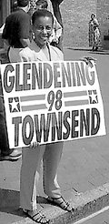 photos by Mark BurnsGwenda Harrison of Annapolis, left, greeted Governor Glendening's campaign bus at City Dock.
