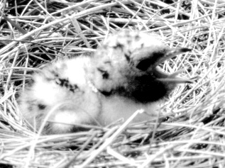 As soon as a tern chick is strong enough, it wobbles away from the nest for the protection of high grass. On more occasion than one, I've see a parent returning to the island with a fish in its beak, apparently unable to find its chick. They'll hover here and hover there, peering. Sometimes, when they land, they'll discover just in time that they've got the wrong chick and have to snatch back the minnow, climb to hover height and begin the search all over again.