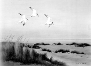 Little as it is, a tern is an inspiring character. At four ounces, the weight of as many rolls of film, a tern's fuselage seems too light for its yardstick-long wing spread. The sharp-looking black cap on its tiny head and the black trailing edges on its wing feathers contrast dramatically with a brilliant white body, giving the tern an air of proud distinction. Elongated tail feathers lend an added measure of class to the tern's look and a swallow-like grace to its flight profile.