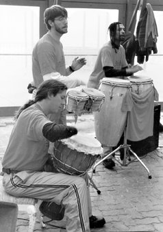 Unity walkers Callens, Ben Thompson and Ajax Joe Drayton, left, drum up their spirits at a kickoff party the day before beginning their 3,200-mile hike.