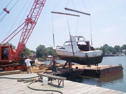 Each drained boat is dragged into position by the most important piece of equipment on the site: the crane. The boat must be placed in deep enough water so that the slings that will lift the boat into the barge can be put into place. A diver in scuba gear passes the two large, thick canvas straps under the boat, one near the bow and one near the stern. Once the slings are in place, they are attached to a pair of cables from the crane and the boat is almost ready to be lifted. Pumps are removed, the boat is untied from the pier and guide ropes are attached at the bow and the stern. The boat is then lifted clear of the water and wrangled into the barge by three men working as a team, one in the crane and the other two on the barge holding the guide ropes.