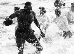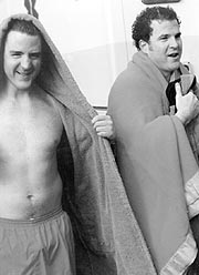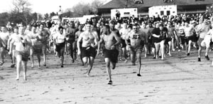 Even with the slow-moving line, the atmosphere was carnival-like, as people met and chatted, a bit giddy at what we were about to do. Adding to the festive air were the costumes. One couple came dressed as caveman and cavewoman, looking like Fred and Wilma Flintstone, only colder, their bare flesh goose-bumping visibly from 15 feet. Another man was dressed as an overgrown Telletubby. Baltimore Ravens defensive end Michael McCrary, who last year wore a pink tutu, wore more macho attire, appearing as Crocodile Dundee.